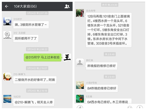 “阿姨,3樓廁所水管爆了?!薄榜R上過來收拾!”這是記者在“10#大家庭”微信群中看到的兩條留言。為了提高工作效率和學生宿舍管理工作的質量,從2015年起,我校開始嘗試“互聯網+”公寓管理新模式,搭建了公寓管理微信交流平臺。一年來,實現了1385個學生宿舍全面覆蓋,解決各類問題、矛盾近500起,為公寓管理工作插上了信息化的翅膀,并得到了在校學生、公寓管理工作者及學生工作者的一致好評。