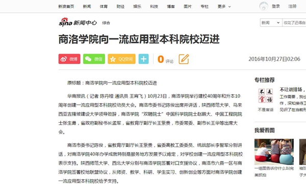 在我校建校40周年暨升本10周年之際,《中國教育報》、《陜西日報》、陜西省教育廳網站、《商洛日報》、商洛電視臺、新華網、新浪網、鳳凰網等23家媒體紛紛對我校改革發(fā)展成就進行了報道,共發(fā)表專題報道文章、視頻新聞37篇(條)。