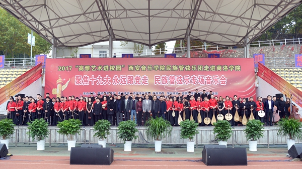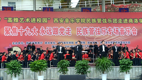 10月25日,由陜西省教育廳主辦的陜西省2017年“高雅藝術(shù)進(jìn)校園”系列活動(dòng)——西安音樂學(xué)院民族管弦樂專場(chǎng)音樂會(huì)在我校舉辦,音樂會(huì)以“聚焦十九大 永遠(yuǎn)跟黨走”為主題。來自西安音樂學(xué)院的85名演員為我校師生奉獻(xiàn)了一場(chǎng)精彩的視聽盛宴。西安音樂學(xué)院紀(jì)委書記劉曉霞、副書記全勇,校領(lǐng)導(dǎo)龍治剛、王思懷、魏書堂、劉寶盈、劉勇,來商參加漢江流域大學(xué)聯(lián)盟宣傳思想工作聯(lián)席會(huì)的代表與全校師生一同欣賞了音樂會(huì)。