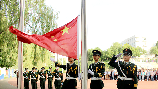 迎著清晨的第一縷陽光,國旗護衛(wèi)隊邁著鏗鏘有力的步伐護送鮮艷的五星紅旗至升旗臺。伴隨著激昂雄壯的國歌聲,五星紅旗冉冉升起,迎風飄揚,全體師生肅立行注目禮,表達對國旗的尊敬和對祖國的熱愛。
