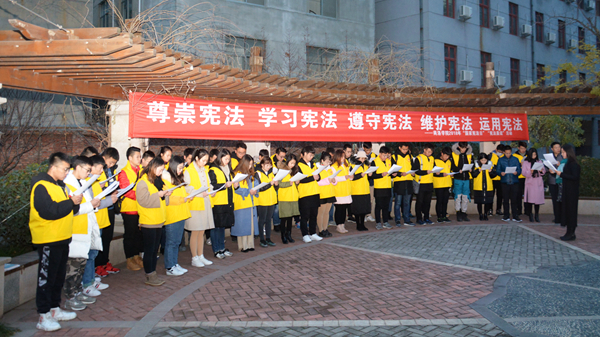 12月4日是我國(guó)第五個(gè)國(guó)家憲法日暨第18個(gè)全國(guó)法制宣傳日。今天早晨,我校在一號(hào)教學(xué)樓前舉行升國(guó)旗儀式并在莘子苑舉行憲法晨讀活動(dòng)。校黨委宣傳部、團(tuán)委負(fù)責(zé)人及相關(guān)人員,青馬班學(xué)員、健康管理學(xué)院學(xué)生代表參加活動(dòng)。
