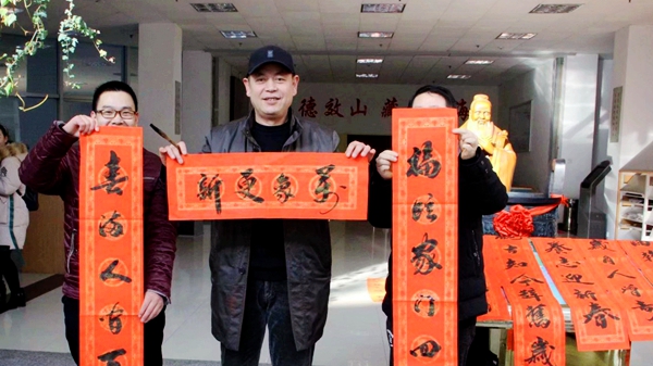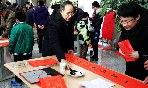我校書(shū)法協(xié)會(huì)主席李尚民,書(shū)法協(xié)會(huì)會(huì)員劉勇、寇世珍、魏振中、陳玉柱、王威、李志超、李中合、張長(zhǎng)林、祁志華、袁志正、劉宇昭等悉數(shù)到場(chǎng),用濃墨“鴻國(guó)節(jié),恭辭舊歲”,以重彩“錦福春,賀迎新年”。他們現(xiàn)場(chǎng)揮毫潑墨,為師生書(shū)寫(xiě)春聯(lián),展示書(shū)法的藝術(shù)魅力。