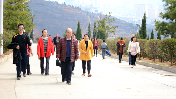 位于商洛市中心廣場(chǎng)北邊的金鳳山,有寬闊的水泥路和蜿蜒曲折的臺(tái)階通往山頂,參加活動(dòng)的教職工們熱情高漲、意趣盎然,三五成群結(jié)伴而行,一邊呼吸著新鮮空氣,一邊飽覽自然美景,或大步流星拾級(jí)而上,或相互鼓勵(lì)穩(wěn)步前行,一路灑下歡歌笑語。待到山頂極目遠(yuǎn)眺,周邊風(fēng)景盡收眼底,美麗的丹江宛若玉帶穿城而過,一幢幢高樓沿江林立,一條條公路向遠(yuǎn)方延伸,春風(fēng)伴著美景,令人心曠神怡,大家紛紛合影留念,定格快樂。