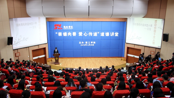 活動(dòng)在《公民道德歌》悠揚(yáng)的歌聲中拉開(kāi)序幕。隨后,學(xué)生代表朗誦《道德之歌》《道德經(jīng)》,在場(chǎng)師生共同觀看了2017年感動(dòng)中國(guó)十大人物溫州“蘭小草”的頒獎(jiǎng)視頻和我校最美學(xué)子、“中國(guó)好人”唐偉麗的事跡視頻。學(xué)生代表王欣表示,作為青年大學(xué)生,在今后的學(xué)習(xí)和生活中要以道德楷模為榜樣,從現(xiàn)在做起,從身邊的小事做起,做一名崇德向善、傳遞愛(ài)心的人。
