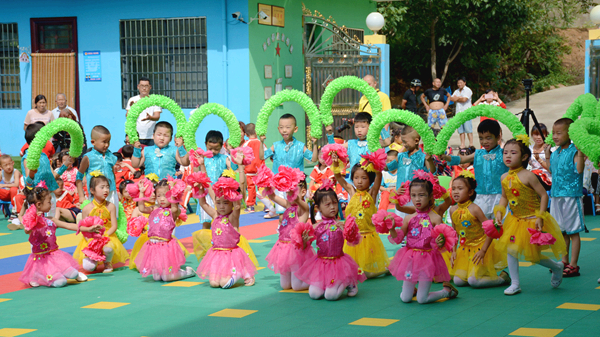 兩嶺幼兒園園長米嬌致答謝詞。幼兒園小朋友們現(xiàn)場表演了精彩的鑼鼓舞和花環(huán)舞,并為嘉賓們送去愛心糖果、手工折紙等以表感謝。