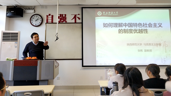 為深入學(xué)習(xí)黨的十九屆四中全會精神,促進(jìn)思政課教學(xué)改革,提高課堂教學(xué)質(zhì)量。12月4日下午,我校特邀“陜西高校思政課教師大練兵”教學(xué)標(biāo)兵、陜西師范大學(xué)副教授張帆來校,以《如何理解中國特色社會主義制度的優(yōu)越性》為題講述了一堂公開示范課。我校馬克思主義學(xué)院班子成員、全體教師及思政1801班學(xué)生聆聽了示范課。