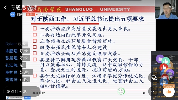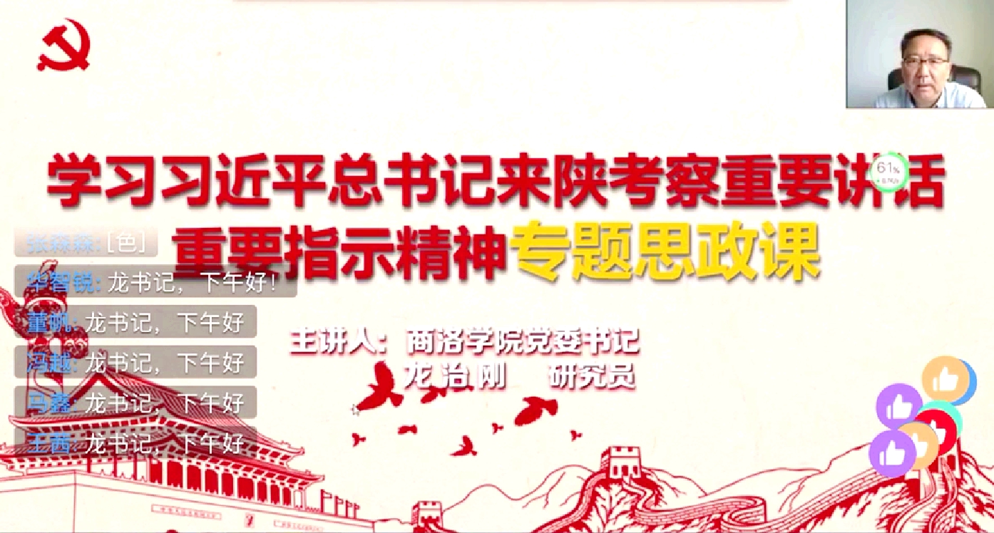 4月20日至23日,習(xí)近平總書記來(lái)陜考察并發(fā)表重要講話,為陜西譜寫新時(shí)代追趕超越新篇章鼓舞了士氣、指明了方向,在全省人民群眾中引發(fā)了熱烈反響。學(xué)習(xí)好、宣傳好、貫徹好習(xí)近平總書記重要講話重要指示精神,是當(dāng)前和今后一個(gè)時(shí)期全校的首要政治任務(wù)。5月27日,按照校黨委的統(tǒng)一安排,我校7位校領(lǐng)導(dǎo)與2000余名青年學(xué)生“云端”共聚,以線上專題思政課的形式把學(xué)習(xí)習(xí)近平總書記來(lái)陜考察重要講話重要指示精神引向深入,在全校上下掀起新一輪的學(xué)習(xí)熱潮。