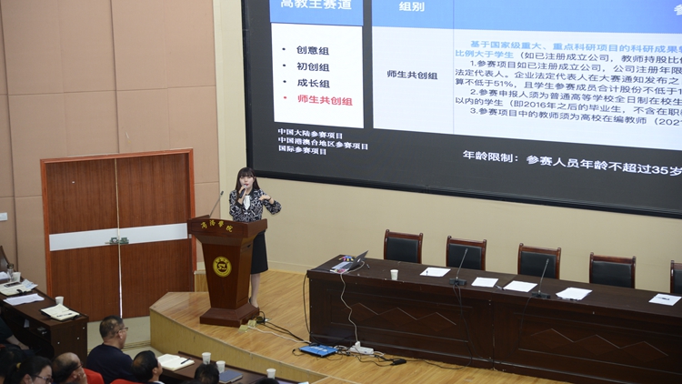 啟動(dòng)儀式結(jié)束后,楊丹為師生作了專題輔導(dǎo)報(bào)告。她結(jié)合多年“互聯(lián)網(wǎng)+”大賽指導(dǎo)經(jīng)驗(yàn),分別從大賽背景、規(guī)則解讀、項(xiàng)目溯源、評(píng)審視角、備賽要點(diǎn)五個(gè)方面,全面細(xì)致、深入淺出的為師生剖析了本屆“互聯(lián)網(wǎng)+”大賽的目標(biāo)任務(wù)、賽項(xiàng)制度和關(guān)鍵環(huán)節(jié),重點(diǎn)介紹了備賽、預(yù)賽、省賽等不同階段的目標(biāo)任務(wù)。