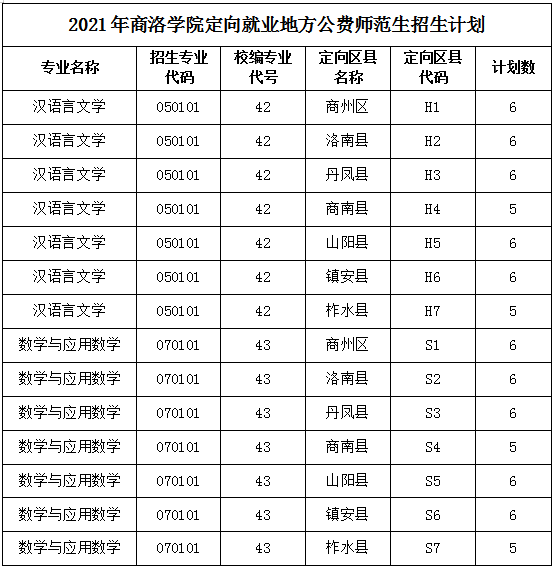 2021年我校招收定向就業(yè)地方公費師范生的專業(yè)有漢語言文學(xué)和數(shù)學(xué)與應(yīng)用數(shù)學(xué),招生計劃各40名,分別以定向就業(yè)商洛市各區(qū)、縣設(shè)置招生代碼,招生批次為提前批本科。