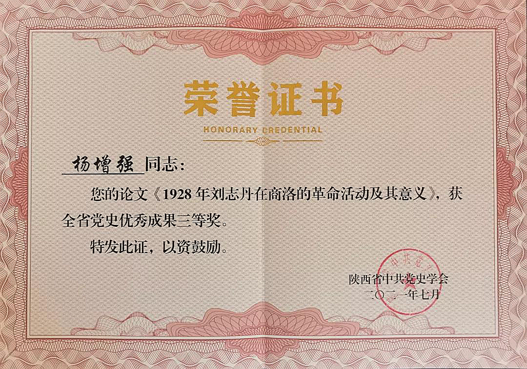 黨史學(xué)習(xí)教育開展以來,陜西省中共黨史學(xué)會在全省范圍內(nèi)開展了研究成果評獎活動。我校楊增強(qiáng)教授的論文《1928年劉志丹在商洛的革命活動及其意義》在評選活動中獲得全省黨史優(yōu)秀成果三等獎。