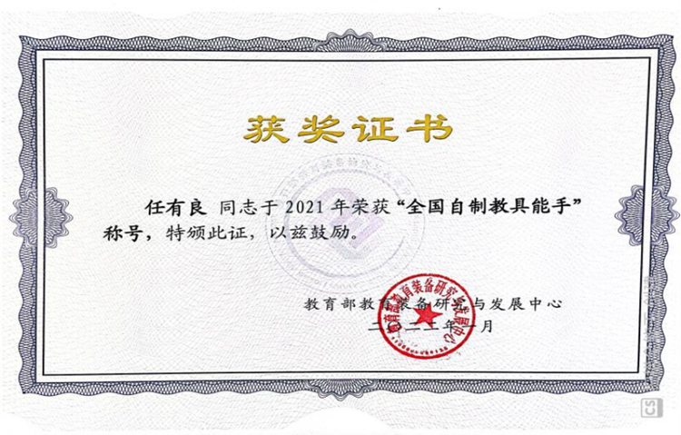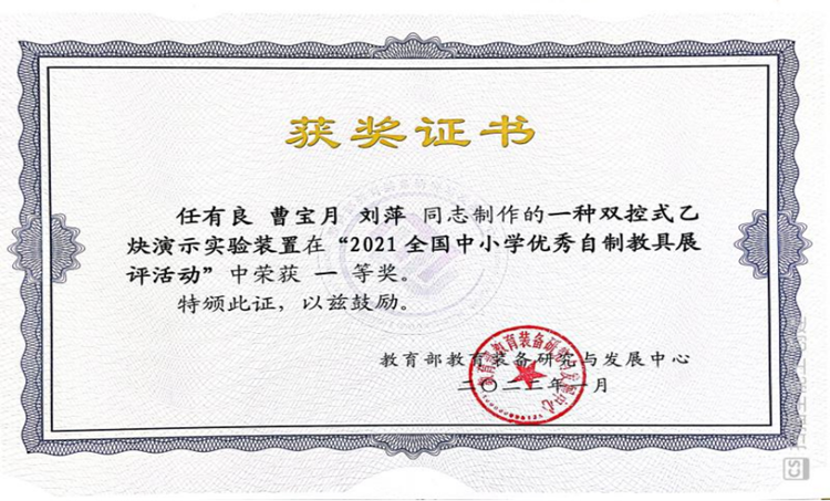 近日,教育部教育裝備研究與發(fā)展中心舉辦了“2021全國中小學(xué)優(yōu)秀自制教具展評活動”,我?;瘜W(xué)工程與現(xiàn)代材料學(xué)院教師任有良、曹寶月、劉萍的參展作品“一種雙控式乙炔演示實驗裝置”獲全國一等獎,任有良獲“全國自制教具能手”稱號。