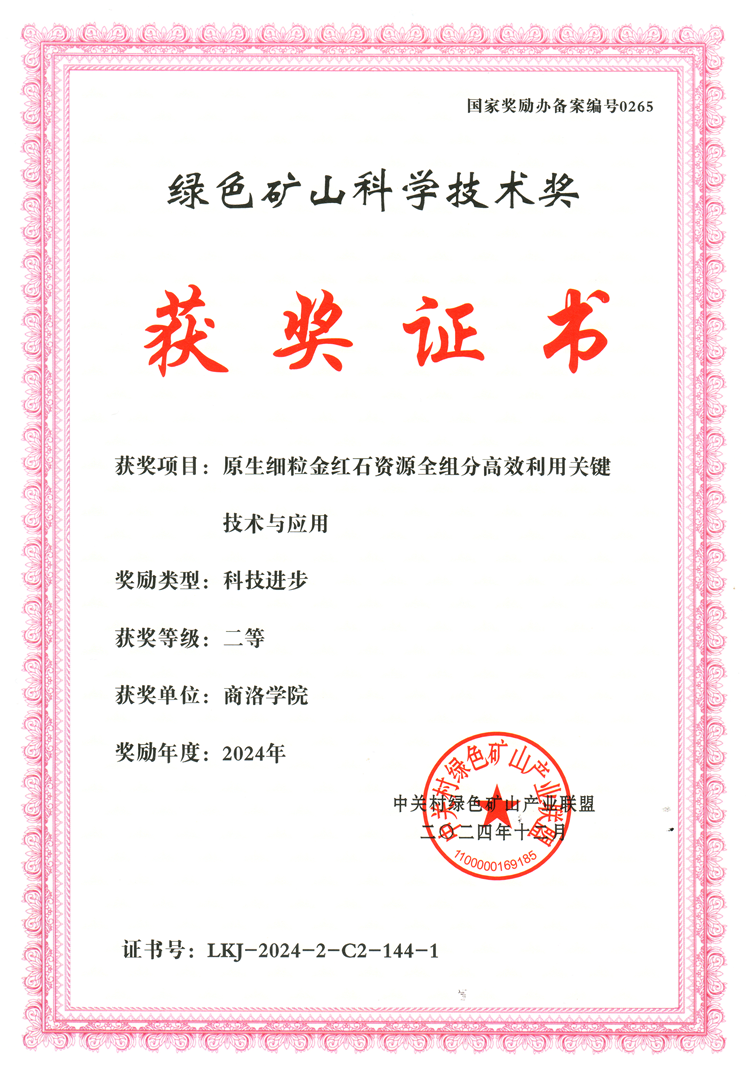 據(jù)悉,綠色礦山科學(xué)技術(shù)獎(jiǎng)(國(guó)家獎(jiǎng)勵(lì)辦備案編號(hào)0265)是國(guó)家獎(jiǎng)勵(lì)辦于2015年正式批準(zhǔn),旨在對(duì)綠色礦產(chǎn)勘查、綠色礦業(yè)發(fā)展和礦山建設(shè)中引領(lǐng)行業(yè)進(jìn)步、樹(shù)立行業(yè)標(biāo)桿、推動(dòng)學(xué)科發(fā)展及關(guān)鍵核心技術(shù)研發(fā)過(guò)程中做出突出貢獻(xiàn)的單位和個(gè)人予以表彰。這一獎(jiǎng)項(xiàng)的獲得,充分肯定了我校在推動(dòng)秦嶺域內(nèi)礦產(chǎn)資源綠色精深開(kāi)發(fā)科技進(jìn)步方面的突出貢獻(xiàn),有力彰顯了我校在綠色礦山建設(shè)領(lǐng)域的行業(yè)影響力。
