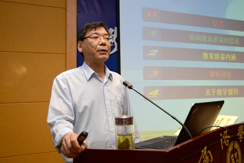 研討會(huì)上,韓江水教授作了《審核評(píng)估與教學(xué)督導(dǎo)》的主題報(bào)告。報(bào)告分析了當(dāng)前高等教育面臨的形勢(shì)與任務(wù)、內(nèi)部與外部環(huán)境、機(jī)遇與挑戰(zhàn),指出以提升教學(xué)質(zhì)量為核心的內(nèi)涵式發(fā)展已經(jīng)成為高等教育的主題,高校教育綜合改革已經(jīng)展開,地方本科高校轉(zhuǎn)型發(fā)展不斷深化。報(bào)告從影響教育質(zhì)量的因素、如何提高與保障教育質(zhì)量、審核評(píng)估、關(guān)于教學(xué)督導(dǎo)的思考四部分,進(jìn)行了詳細(xì)、系統(tǒng)地講解,分析了教學(xué)督導(dǎo)職能的變革與轉(zhuǎn)變、督導(dǎo)工作方式方法的創(chuàng)新,提出了“三督一專兩機(jī)一平”的督導(dǎo)模式。