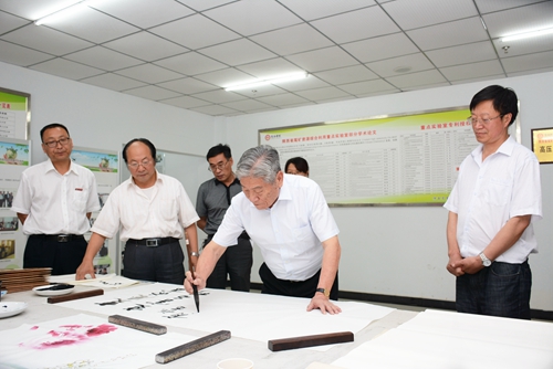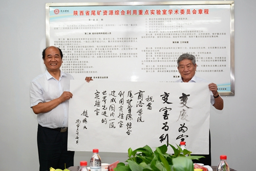 參觀時(shí),趙鵬大院士親筆為重點(diǎn)實(shí)驗(yàn)室題寫“變廢為寶,變害為利”,并祝愿我校尾礦資源綜合利用重點(diǎn)實(shí)驗(yàn)室建成國(guó)內(nèi)一流、世界先進(jìn)的實(shí)驗(yàn)室?;膶W(xué)院黨總支書記劉全民代表師生向趙鵬大院士贈(zèng)送書法繪畫作品。