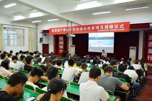 9月14日,由我校與達(dá)內(nèi)集團(tuán)合作的教育部產(chǎn)學(xué)合作專業(yè)綜合改革項(xiàng)目授牌儀式在二樓報(bào)告廳舉行。校黨委副書記、副校長(zhǎng)范新會(huì)出席活動(dòng)并授牌,達(dá)內(nèi)集團(tuán)西北區(qū)總經(jīng)理陳相峰與數(shù)計(jì)學(xué)院院長(zhǎng)張林接牌。數(shù)計(jì)學(xué)院師生、達(dá)內(nèi)集團(tuán)相關(guān)負(fù)責(zé)人參加活動(dòng)?;顒?dòng)由教務(wù)處處長(zhǎng)李超主持。