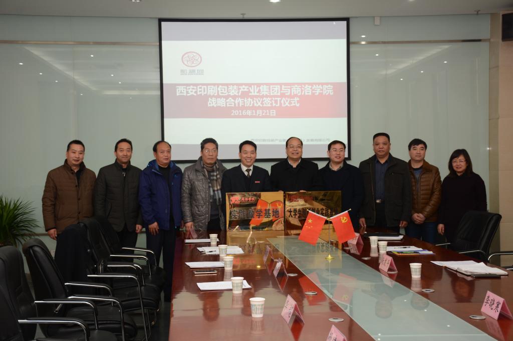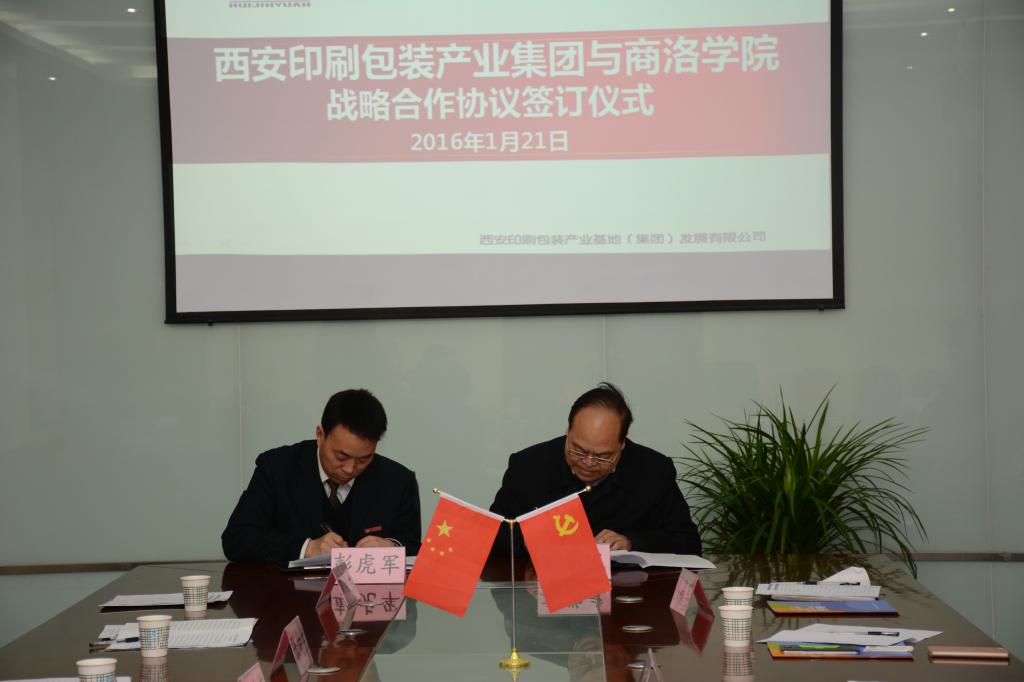 2016年1月21日,我校與西安印刷包裝產(chǎn)業(yè)集團(tuán)在西安經(jīng)濟(jì)技術(shù)開(kāi)發(fā)區(qū)草灘生態(tài)產(chǎn)業(yè)園簽署戰(zhàn)略合作協(xié)議并舉行授牌儀式。校黨委副書(shū)記彭虎軍與西安印刷包裝產(chǎn)業(yè)集團(tuán)董事長(zhǎng)袁學(xué)武代表校企雙方在協(xié)議上簽字。彭虎軍在簽約儀式之后向西安印刷包裝產(chǎn)業(yè)集團(tuán)授予“商洛學(xué)院大學(xué)生創(chuàng)新創(chuàng)業(yè)實(shí)踐基地”和“商洛學(xué)院教學(xué)實(shí)踐基地”牌。學(xué)校黨政辦公室、教務(wù)處、學(xué)生處、招生就業(yè)處等部門領(lǐng)導(dǎo),西安印刷包裝產(chǎn)業(yè)集團(tuán)黨總支副書(shū)記劉海軍及集團(tuán)有關(guān)部門人員參加了簽約授牌儀式。簽約授牌儀式由劉海軍主持。
