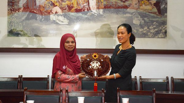 經(jīng)濟(jì)管理學(xué)院副院長周小婷向Hazlina老師贈送了以商洛核桃為材質(zhì)的工藝品——“吉慶有余”中國結(jié),祝愿兩校之間的合作百尺竿頭,更進(jìn)一步,祝愿兩校師生之間的友誼地久天長。