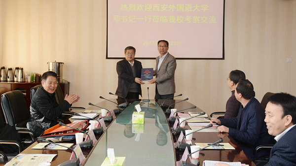 11月23日,西安外國語大學(xué)黨委書記鄧志輝一行5人來我??疾旖涣?,黨委書記龍治剛、黨委副書記彭虎軍陪同考察并與鄧志輝一行進(jìn)行了座談交流。