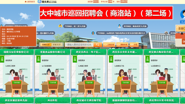 本次招聘會依托貓頭英云就業(yè)平臺開展,吸納了省內(nèi)外246家用人單位參會,其中包括河南國控建設(shè)集團(tuán)有限公司、國核寶鈦鋯業(yè)股份公司、寧夏建龍?zhí)劁撚邢薰?、陜西地礦第二工程勘察院有限公司等業(yè)內(nèi)知名企業(yè)以及西安城市交通技師學(xué)院、西安信息工程技師學(xué)院等師范教育類用人單位,為我校畢業(yè)生提供土木土建、師范教育、電子商務(wù)、外語外貿(mào)、學(xué)前教育、電氣工程、金融會計、化學(xué)化工、生物醫(yī)藥等多個行業(yè)領(lǐng)域的有效對口崗位達(dá)6930多個。招聘會開展期間,我校1787名畢業(yè)生參會,在線參加面試926人(次),達(dá)成初步就業(yè)意向334人(次)。