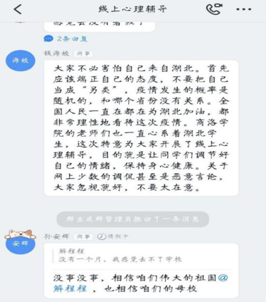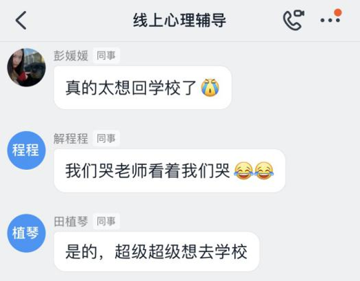 輔導會開展過程中,學生們積極參與討論,很多學生表示“超級超級想去學?!薄爸幌肴ド蠈W”,當然學生們也會擔憂自己回學校就被隔離了,擔心因為自己是湖北人而受到大家的異樣眼光。輔導老師針對學生的這些焦慮、恐懼等負性情緒進行了線上輔導,學生們表示“相信咱們的母校、相信咱們偉大的祖國”。