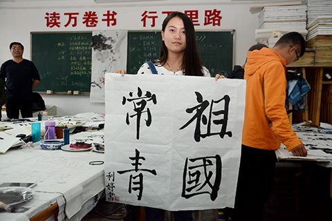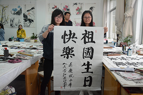 學生胡甜甜說道,書法是中國傳統(tǒng)文化的瑰寶,在祖國67華誕即將到來之際,用書法作品表達對祖國的愛,覺得很有意義,也深受教育。學生許佳妮說,作為當代大學生,我們要認真學習,練就報效祖國的本領(lǐng),為實現(xiàn)中國夢做出自己的貢獻!祝祖國繁榮昌盛,美麗富強!