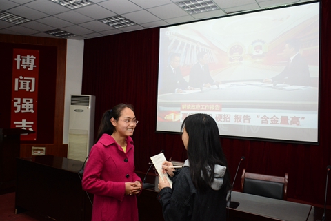 3月3日和3月5日,政協(xié)第十二屆全國委員會第五次會議、十二屆全國人大五次會議分別在北京人民大會堂開幕。我校組織師生在報告廳集中收看了開幕式實況直播,師生們分別通過手機、網(wǎng)絡(luò)、電視、廣播等媒體積極收看收聽,對兩會精神、熱點話題進行了學習討論。
