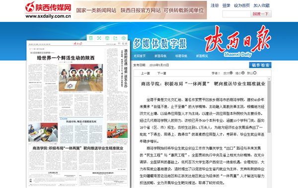 5月15日,《陜西日報》第11版以《商洛學院:積極布局“一體兩翼” 靶向推送畢業(yè)生精準就業(yè)》為題,對我校就業(yè)工作進行了專題報道。