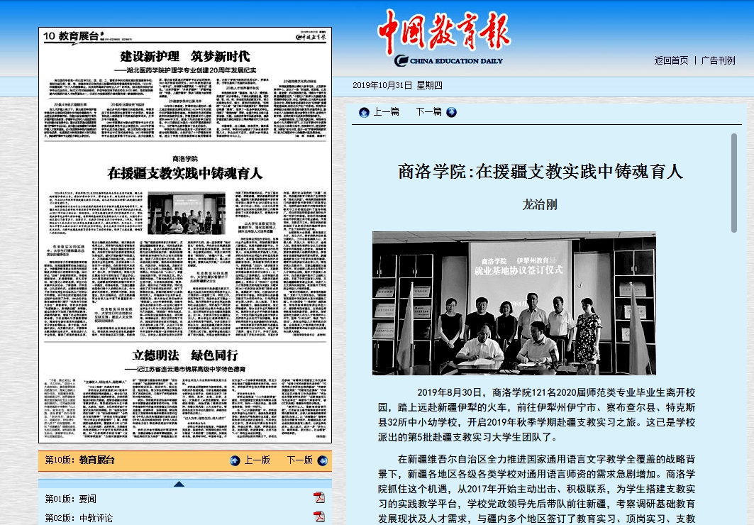 黨委書記龍治剛在《中國教育報》2019年10月31日教育展臺版面發(fā)表署名文章《商洛學(xué)院:在援疆支教實踐中鑄魂育人》,全文如下: