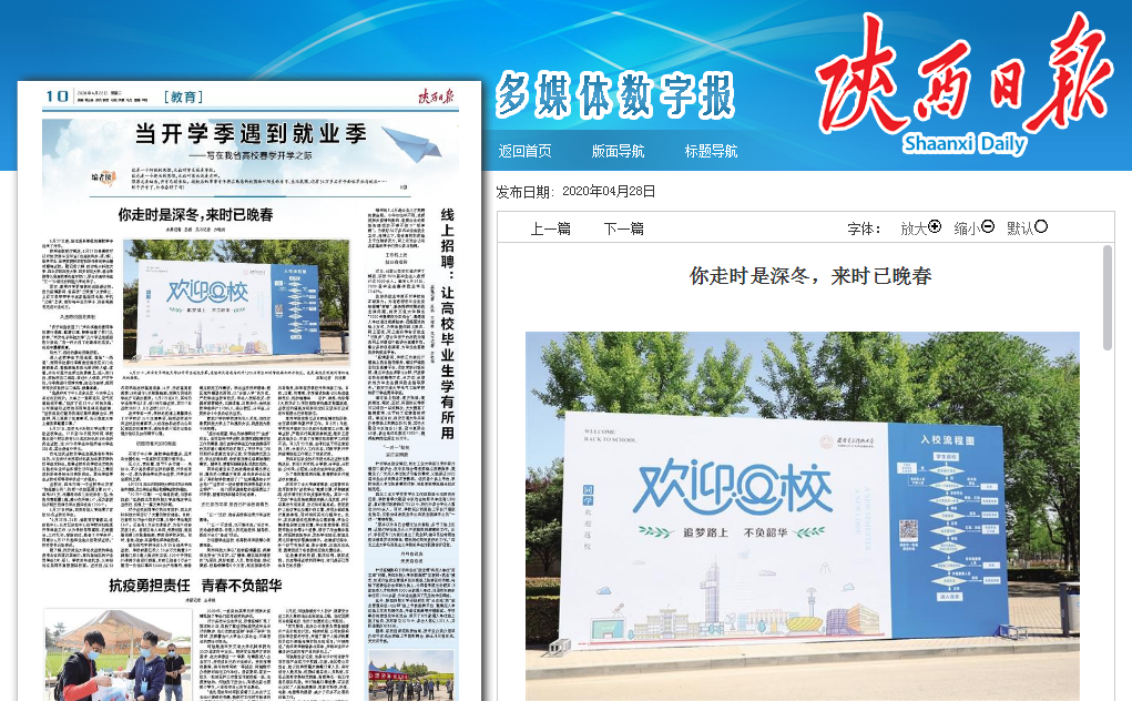 按照省教育廳規(guī)定,4月27日各高??梢蚤_始安排畢業(yè)年級(jí)(含高職和本、碩、博)、醫(yī)學(xué)專業(yè)、醫(yī)學(xué)類院校和有科研任務(wù)的學(xué)生錯(cuò)時(shí)錯(cuò)峰返校。近日,陜西日報(bào)記者深入省內(nèi)高校,采訪報(bào)道了包括我校在內(nèi)的數(shù)所高校,精心做好疫情防控和開學(xué)準(zhǔn)備工作,在明媚春光中,敞開校門,擁抱歸來學(xué)子。其中涉及我校內(nèi)容如下: