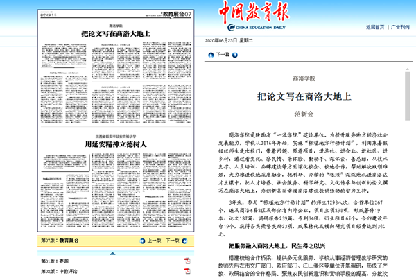 校長范新會(huì)在《中國教育報(bào)》2020年6月23日教育展臺(tái)版面發(fā)表署名文章《把論文寫在商洛大地上》,全文如下: