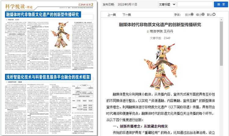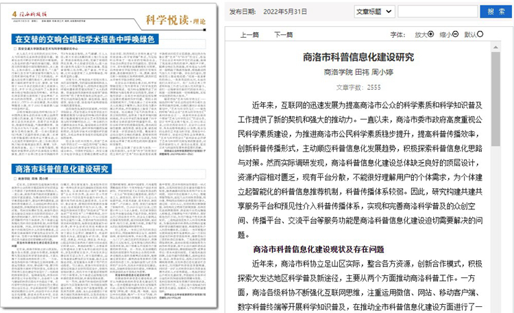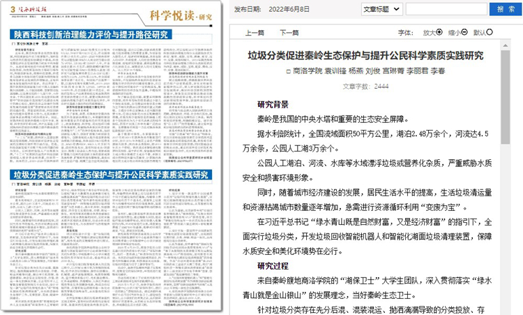 5月份以來,我校教師袁訓(xùn)鋒、田祎、王丹丹先后在《陜西科技報(bào)》理論版刊發(fā)《垃圾分類促進(jìn)秦嶺生態(tài)保護(hù)與提升公民科學(xué)素質(zhì)實(shí)踐研究》《商洛市科普信息化建設(shè)研究》《融媒體時(shí)代非物質(zhì)文化遺產(chǎn)的創(chuàng)新型傳播研究》三篇文章,圍繞秦嶺生態(tài)保護(hù)、科普信息化建設(shè)、非物質(zhì)遺產(chǎn)創(chuàng)新傳播等主題,介紹我??蒲蟹?wù)地方實(shí)踐成果和經(jīng)驗(yàn)。文章主要內(nèi)容如下: