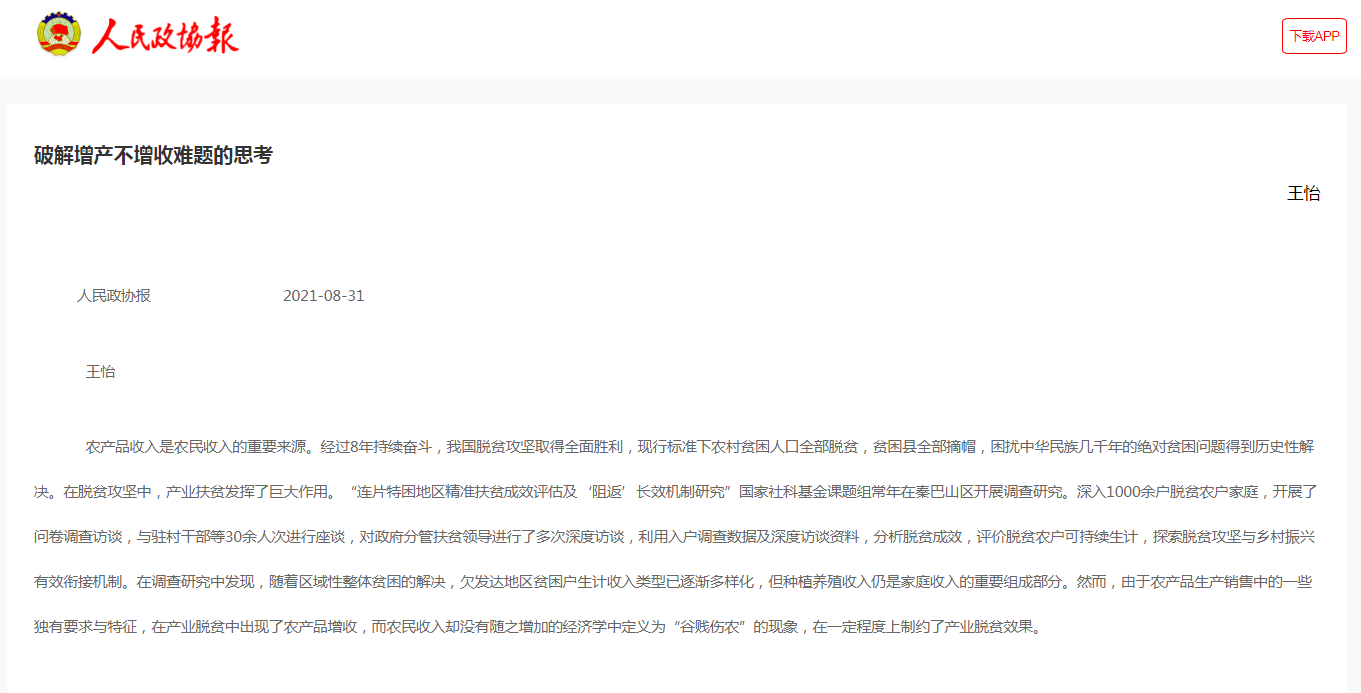 《人民政協(xié)報(bào)》2021年8月31日刊發(fā)了我校陜西高校新型智庫(kù)商洛發(fā)展研究院院長(zhǎng)王怡署名文章《破解增產(chǎn)不增收難題的思考》,對(duì)文章中的國(guó)家社科基金項(xiàng)目“連片貧困地區(qū)精準(zhǔn)扶貧成效評(píng)估及‘阻返’長(zhǎng)效機(jī)制研究”的研究成果做了專題報(bào)道。