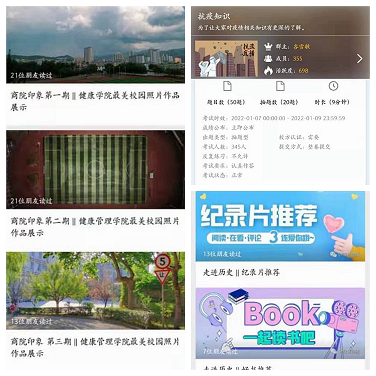 為切實做好疫情封校期間學(xué)生防疫知識普及、心理疏導(dǎo)等工作,進(jìn)一步加強對學(xué)生的人文關(guān)懷,健康管理學(xué)院團(tuán)總支堅持以學(xué)生為主體,以育人為中心,以活動為載體,堅持貼近實際、貼近生活、貼近學(xué)生原則,借助學(xué)院微信公眾號、易班平臺等載體,開展了一系列內(nèi)容鮮活、形式新穎、吸引力強的活動,活動效果良好。