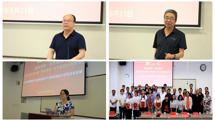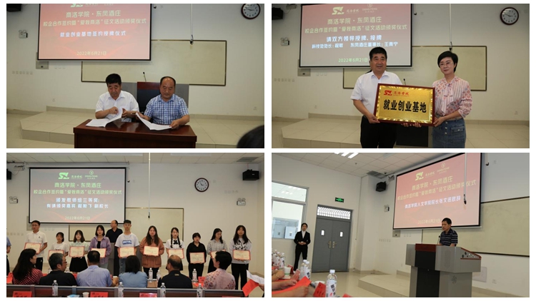 6月21日,人文學(xué)院與陜西東鳳酒莊有限公司共同舉辦校企合作簽約儀式暨“愛(ài)我商洛”征文活動(dòng)頒獎(jiǎng)活動(dòng)?!渡搪迦?qǐng)?bào)社》總編輯南書堂、商洛市作協(xié)主席魚在洋、丹鳳縣政府教育督導(dǎo)室主任白寬虎、丹鳳縣科技統(tǒng)籌中心主任李書軍、丹鳳縣委黨校副校長(zhǎng)程毅飛、商洛學(xué)院科技處處長(zhǎng)程敏、商洛學(xué)院教務(wù)處副處長(zhǎng)李會(huì)榮、陜西東鳳酒莊有限公司總經(jīng)理王青寧、商洛學(xué)院人文學(xué)院全體黨政領(lǐng)導(dǎo)出席。征文活動(dòng)獲獎(jiǎng)?wù)吆蜕搪鍖W(xué)院人文學(xué)院師生代表共一百余人參加了活動(dòng)?;顒?dòng)由人文學(xué)院副院長(zhǎng)馬英群主持。
