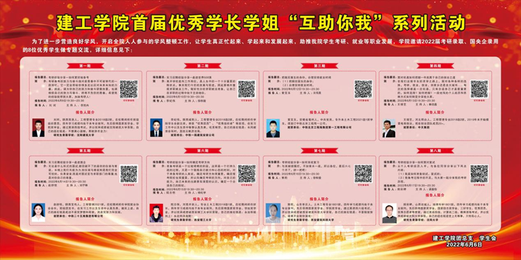 為進(jìn)一步落實(shí)學(xué)院學(xué)風(fēng)整頓計(jì)劃,營(yíng)造良好的傳幫帶學(xué)習(xí)氛圍,助推學(xué)生考研、就業(yè)等持續(xù)良性發(fā)展,6月9日至17日,建工學(xué)院依托學(xué)知論壇,舉辦首屆優(yōu)秀學(xué)長(zhǎng)學(xué)姐“互助你我”系列講座。本次系列講座共有8場(chǎng),邀請(qǐng)來自工程管理、土木工程等專業(yè)的8位2022屆優(yōu)秀畢業(yè)生,通過線上線下相結(jié)合的方式分享了自己的考研、就業(yè)與創(chuàng)業(yè)經(jīng)驗(yàn)。