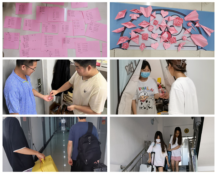 在即將踏上新的人生征途時,畢業(yè)生們收到了來自低年級學弟學妹們的神秘禮物——一張張用心準備的志愿服務卡。卡片上詳細標注著班級、姓名和聯(lián)系方式,并折疊成各式各樣的手工品呈現(xiàn)在畢業(yè)生眼前。有“飛機巨輪、鮮花糖果、蜻蜓蜜蜂”,寓意著祝君啟航、甜蜜、翱翔。畢業(yè)生可隨時撥打電話,志愿服務隊能為其提供物品整理,行李搬運,送站等服務。