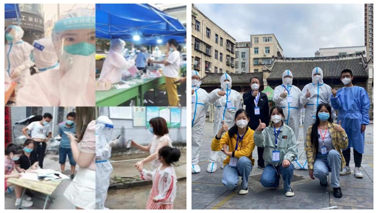面對(duì)暑期各地疫情突發(fā)狀況,人文學(xué)院學(xué)子第一時(shí)間響應(yīng)當(dāng)?shù)卣?hào)召,變身“白墩墩”“紅融融”,協(xié)助醫(yī)護(hù)人員設(shè)置檢測(cè)場(chǎng)地、維持采樣秩序、進(jìn)行掃碼登記、發(fā)放核酸貼紙,確保核酸檢測(cè)工作有序進(jìn)行,為當(dāng)?shù)匾咔榉揽毓ぷ髫暙I(xiàn)青春力量,展現(xiàn)青年責(zé)任擔(dān)當(dāng)。