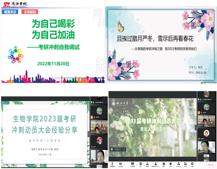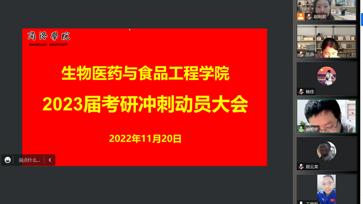 為了充分調(diào)動(dòng)2023屆畢業(yè)生考研積極性,盡早明確考研目標(biāo)與就業(yè)方向, 11月20日晚,生物學(xué)院通過釘釘線上平臺(tái)組織召開了2023屆考研沖刺動(dòng)員大會(huì)。學(xué)院黨政領(lǐng)導(dǎo)、教師代表及2023屆考研學(xué)生參加會(huì)議。