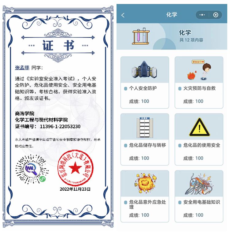 活動(dòng)內(nèi)容主要為慕樂網(wǎng)絡(luò)開發(fā)的虛擬實(shí)驗(yàn)室安全知識(shí)考核,包括個(gè)人安全防護(hù)、火災(zāi)預(yù)防與自救、高溫低溫操作安全、玻璃器材使用安全、?;穬?chǔ)存與轉(zhuǎn)移、?;返氖褂冒踩?、氣瓶使用安全、廢棄物的安全處理與管控、?;芬馔鈶?yīng)急處理、安全用電基礎(chǔ)知識(shí)、高壓釜使用安全、化工原理等實(shí)驗(yàn)室相關(guān)安全知識(shí)。學(xué)生以趣味通關(guān)的方式完成考核,闖關(guān)成功后即獲得實(shí)驗(yàn)室安全考核合格證書。