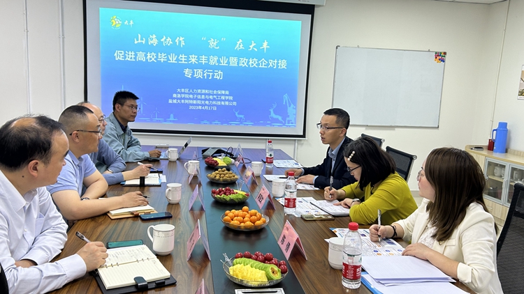 趙永平一行與鹽城大豐區(qū)人社局及鹽城大豐阿特斯陽光電力科技有公司相關(guān)領(lǐng)導(dǎo)進(jìn)行座談交流。大豐區(qū)人社局副局長(zhǎng)劉加?xùn)|介紹了該區(qū)相關(guān)情況及引進(jìn)高校畢業(yè)生的相關(guān)政策,阿特斯總經(jīng)理兼集團(tuán)質(zhì)量部總監(jiān)蒲云飛詳細(xì)介紹了企業(yè)發(fā)展前景、專業(yè)需求、畢業(yè)生入職培養(yǎng)發(fā)展、晉升機(jī)制等方面情況。