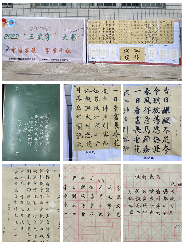 本次大賽自6月初開始,面向全校學(xué)生,從前期報名、動員、院級初賽,到校級決賽歷時近一個月,共有600余人參加初賽,60人進入校級決賽。決賽分為鋼筆組、粉筆組和毛筆組三個賽道。參賽題目、內(nèi)容均選自我國各類優(yōu)秀古詩詞。
