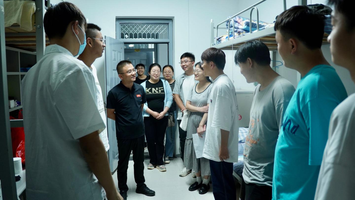 宿舍走訪,貼心溫暖。31日晚上,學(xué)院黨政領(lǐng)導(dǎo)及全體新生班輔導(dǎo)員、班主任分組走訪新生宿舍。老師們對(duì)新生的到來表示熱烈歡迎,關(guān)切詢問大家對(duì)新環(huán)境的適應(yīng)情況,耐心解答同學(xué)們存在的疑惑與問題,并暖心提醒同學(xué)們注意早晚的溫差,以及軍訓(xùn)期間的安全問題。