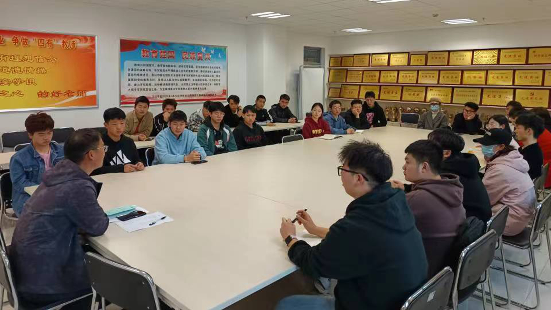 強(qiáng)化班長(zhǎng)隊(duì)伍責(zé)任擔(dān)當(dāng)意識(shí),發(fā)揮班長(zhǎng)的集體帶頭作用及引領(lǐng)作用。11月8日,班長(zhǎng)座談會(huì)上,在對(duì)畢業(yè)學(xué)位資格審查、獎(jiǎng)助學(xué)金評(píng)定、推優(yōu)入黨、綜合素質(zhì)測(cè)評(píng)等方面深入解讀的基礎(chǔ)上,學(xué)院全體輔導(dǎo)員與37位班長(zhǎng)代表圍繞學(xué)習(xí)環(huán)境創(chuàng)設(shè)、學(xué)生寢室用電用水、專業(yè)學(xué)科競(jìng)賽、學(xué)院集體活動(dòng)組織等方面進(jìn)行充分交流。與會(huì)班長(zhǎng)代表劉永杰和徐秋駿就班級(jí)凝聚力建設(shè)、學(xué)風(fēng)建設(shè)、學(xué)生志愿活動(dòng)、活動(dòng)組織等方面進(jìn)行經(jīng)驗(yàn)分享。