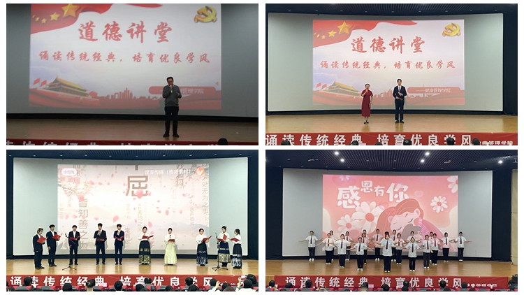 為傳承和弘揚中華優(yōu)秀傳統(tǒng)文化,鞏固學院精神文明和校園文化建設成果,12月14日,健康管理學院舉辦“誦讀傳統(tǒng)經(jīng)典 培育優(yōu)良學風”道德講堂活動。校黨委宣傳部副部長史潔,健康學院院長郭耀東,學院黨委副書記·副院長楊憲華出席活動。學院全體教師及2023級全體學生參加活動。