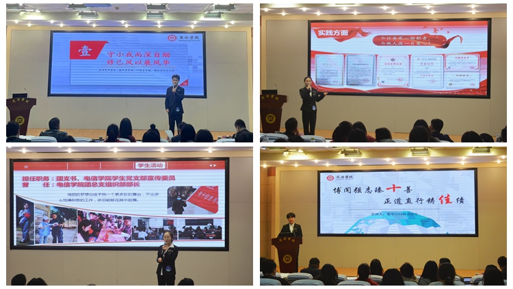 21名“十佳大學(xué)生”初評(píng)對(duì)象中有衛(wèi)國戍邊的退役士兵,有成績(jī)優(yōu)異的“學(xué)業(yè)之星”,有體育競(jìng)技的“運(yùn)動(dòng)達(dá)人”,有服務(wù)同學(xué)的“優(yōu)秀干部”,有志愿服務(wù)的模范青年……大家分別從思想引領(lǐng)、學(xué)業(yè)發(fā)展、社會(huì)實(shí)踐、學(xué)生工作、志愿服務(wù)等方面,全方位展示了商院學(xué)子追求卓越的青春信念和敢為人先的青春風(fēng)采。精彩的答辯贏得了在場(chǎng)師生的陣陣掌聲。