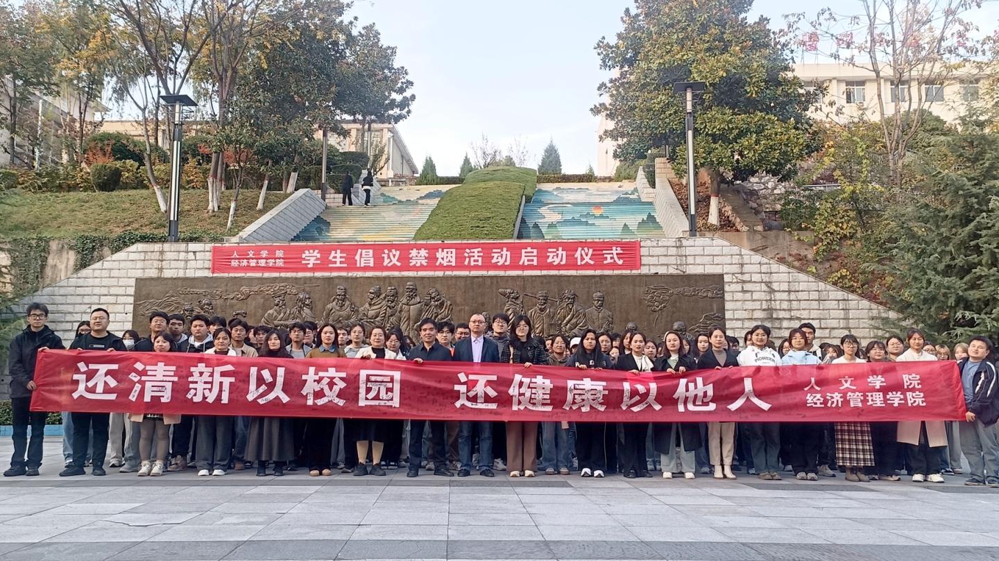 為營造良好校園環(huán)境、倡導(dǎo)校園文明行為新風(fēng)尚,10月29日下午,人文學(xué)院、經(jīng)濟管理學(xué)院聯(lián)合開展以“還清新以校園還健康以他人”為主題的學(xué)生倡議禁煙活動。活動啟動儀式在玉蘭廣場舉行,人文學(xué)院黨委副書記王剛主持啟動儀式。經(jīng)濟管理學(xué)院黨委副書記賈長安講話。兩院學(xué)工辦主任、團總支書記、全體輔導(dǎo)員和學(xué)生代表400余人參加活動。