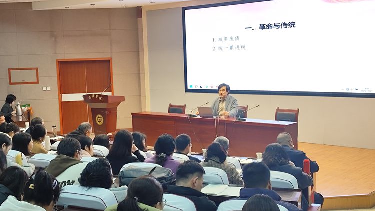 為拓寬思想政治理論課教師學術新視野,夯實研究中國共產黨歷史的理論基礎,11月22日上午,國務院政府特殊津貼專家、教育部長江學者特聘教授、教育部歷史學教學指導委員會委員、南開大學杰出教授李金錚教授應邀為馬克思主義師生作了題為《中共革命史若干問題管窺》的學術報告。馬克思主義學院師生150余人參加了學術報告。報告會由院長蔣正治主持。