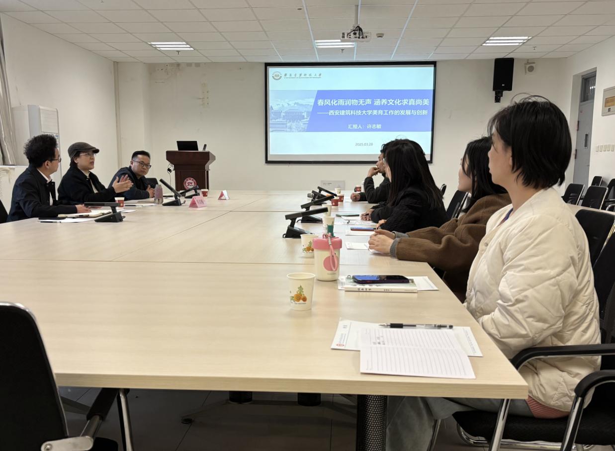 在美育講座中,陜西省高校美育教指委副主任兼秘書長(zhǎng)、西安建筑科技大學(xué)文化藝術(shù)教育中心主任許志敏受邀為我校美育工作辦公室、公共藝術(shù)教育中心相關(guān)成員及藝術(shù)學(xué)院相關(guān)負(fù)責(zé)人作題為《春風(fēng)化雨潤(rùn)物無(wú)聲、涵養(yǎng)文化求真尚美——西安建筑科技大學(xué)美育工作的發(fā)展與創(chuàng)新》的報(bào)告,她結(jié)合高校美育工作經(jīng)驗(yàn),就高校如何遵循美育特點(diǎn)面向全體學(xué)生開展美育工作分享了多元化創(chuàng)新實(shí)施路徑。許志敏提出要發(fā)掘非藝術(shù)專業(yè)學(xué)生的審美需求和藝術(shù)潛能,加強(qiáng)學(xué)生藝術(shù)社團(tuán)在美育活動(dòng)中的引領(lǐng)作用。在互動(dòng)交流環(huán)節(jié),與會(huì)教師就我校美育工作核心任務(wù)、美育師資隊(duì)伍建設(shè)、美育課程建設(shè)等問(wèn)題與許志敏深入交流,現(xiàn)場(chǎng)氣氛熱烈。