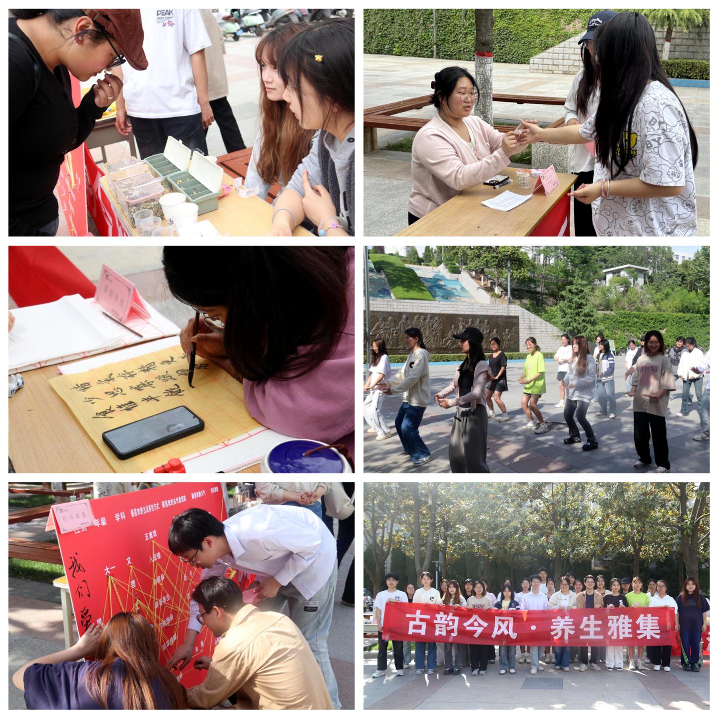 以“古韻流芳”和“本草識真”為主題,師生們互對詩詞,贏取文化信物,辨識中藥材,了解常見中藥材的養(yǎng)生功效,在游戲中感受詩詞魅力,在學習中感受中華醫(yī)學的博大精深。在“丹青逸趣”和“養(yǎng)生功法”環(huán)節(jié),師生們揮毫潑墨,康養(yǎng)社學子現場教學“五禽戲”及“八段錦”,在書畫創(chuàng)作中修養(yǎng)身心,在剛柔并濟的動作中感受古法養(yǎng)生的魅力。