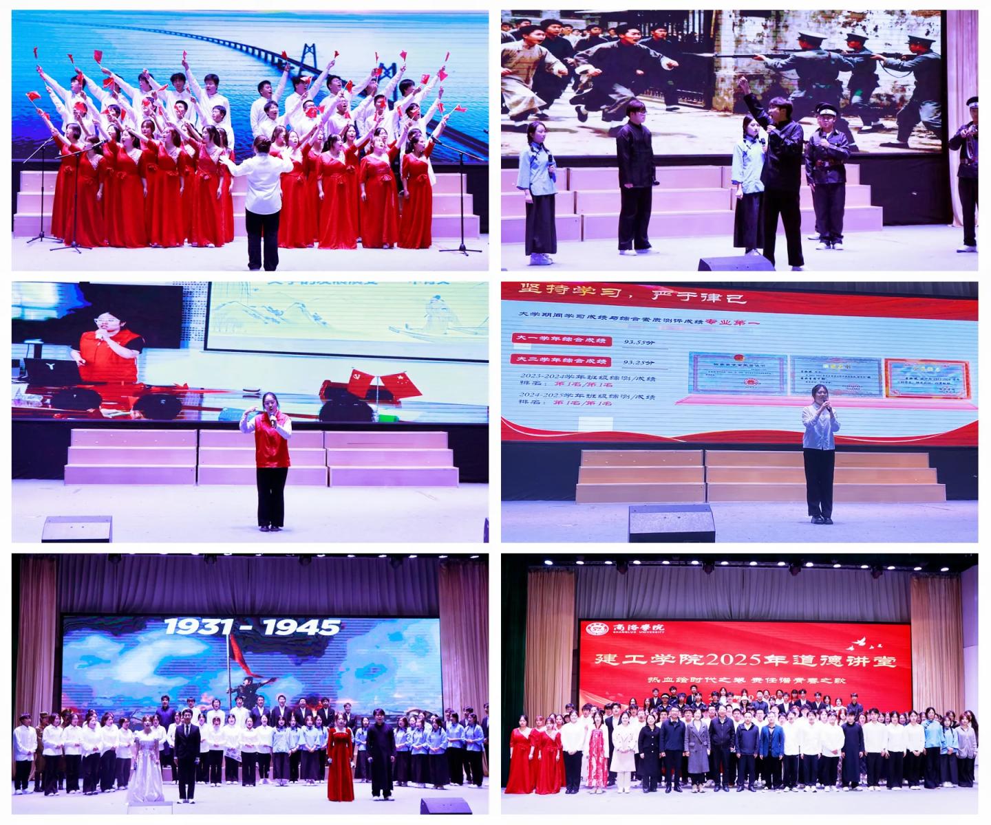 本期道德講堂精心設(shè)計(jì)了“時(shí)政鑄魂”“榜樣示范”“青春踐道”三個(gè)篇章,通過“跳一支舞蹈、誦一段經(jīng)典、唱一首歌曲、講一個(gè)故事、做一個(gè)承諾、演一段歷史、送一份吉祥”等豐富形式,生動(dòng)詮釋了新時(shí)代青年的責(zé)任與擔(dān)當(dāng)。活動(dòng)在舞蹈《領(lǐng)航新時(shí)代》中拉開帷幕,同學(xué)們以充滿力量的舞姿展現(xiàn)出新時(shí)代青年緊跟時(shí)代、奮勇前行的精神風(fēng)貌。誦讀《以青春之氣,逐華夏之夢》抒發(fā)了建工學(xué)子們以夢為馬、投身民族復(fù)興的堅(jiān)定信念。歌曲聯(lián)唱《當(dāng)那一天來臨,團(tuán)結(jié)就是力量》以鏗鏘旋律,唱響了師生團(tuán)結(jié)一心、勇?lián)姑陌簱P(yáng)斗志。
